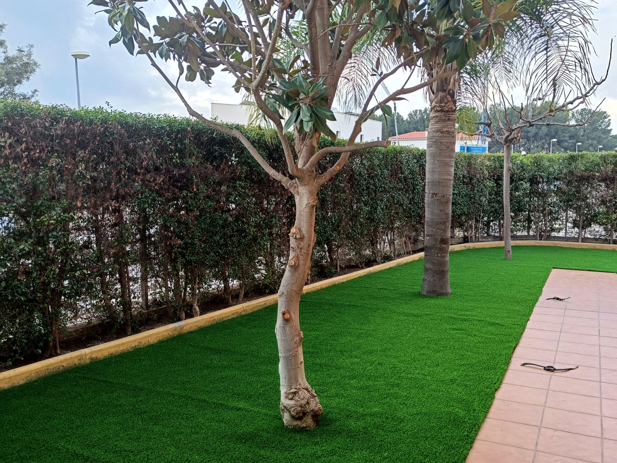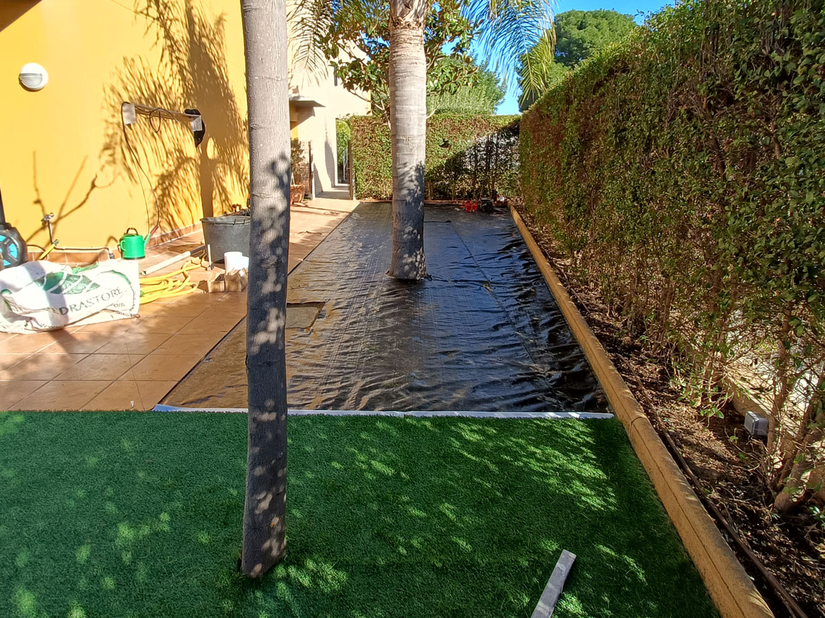 Instal·lació de gespa artificial en petit jardí unifamiliar.