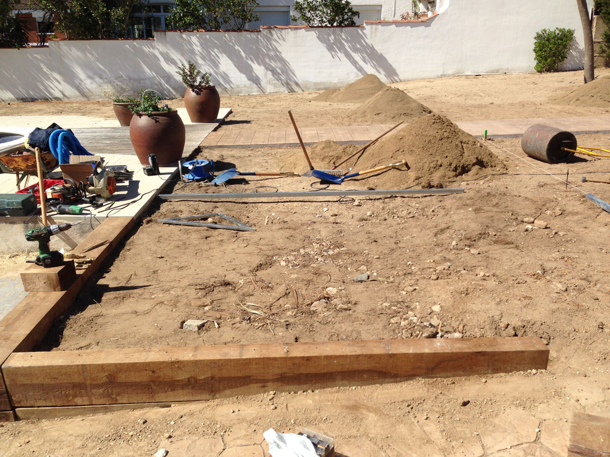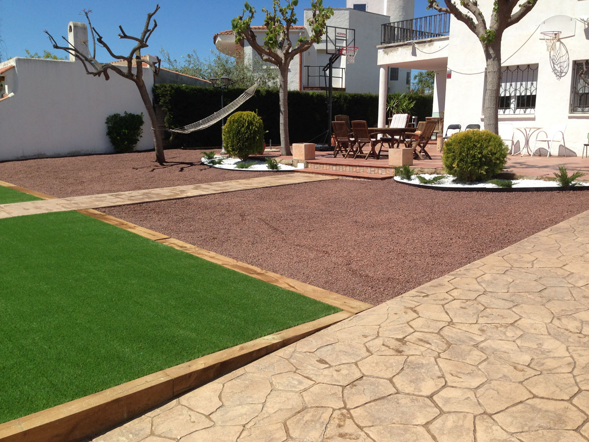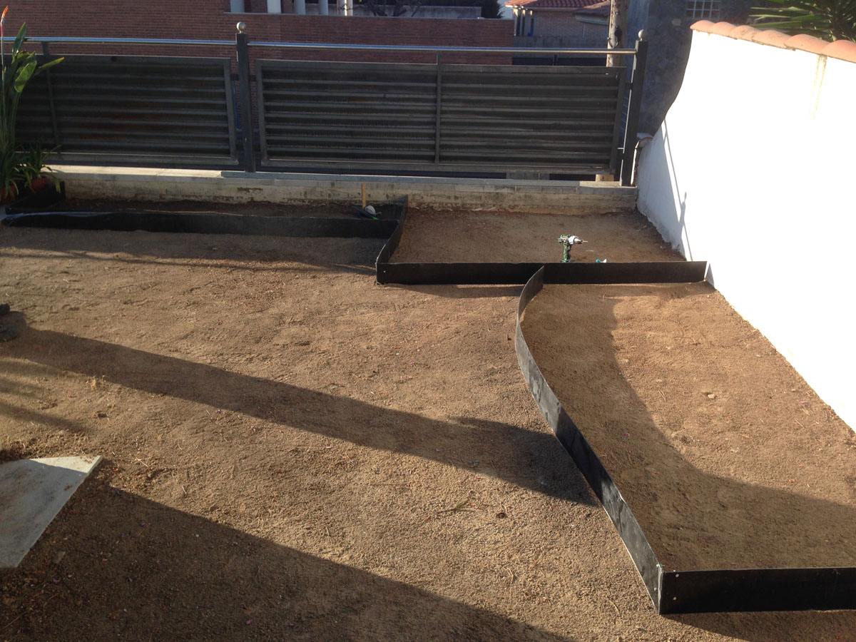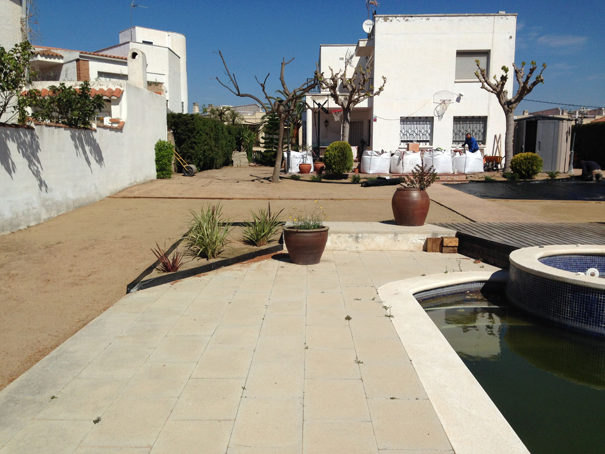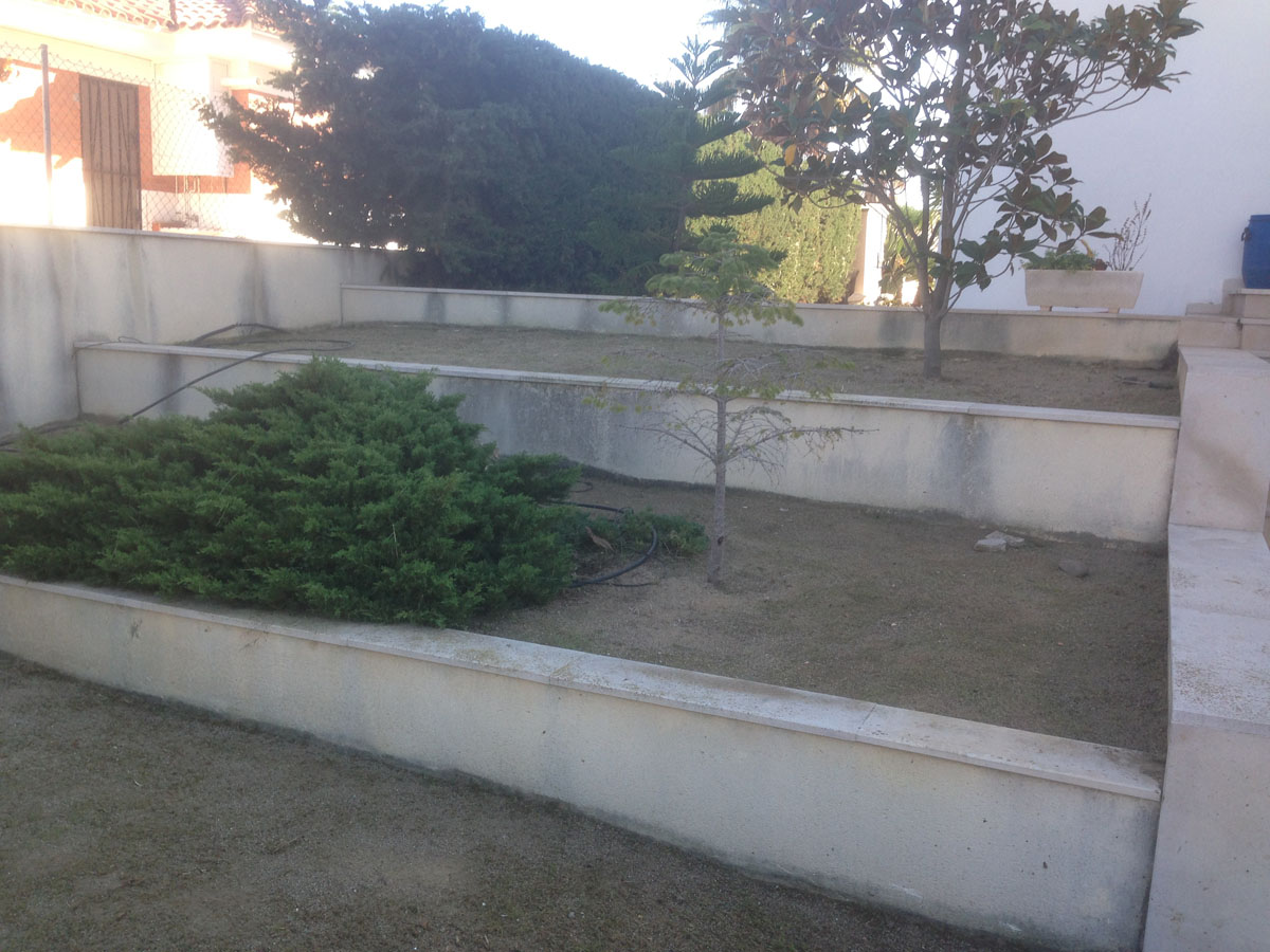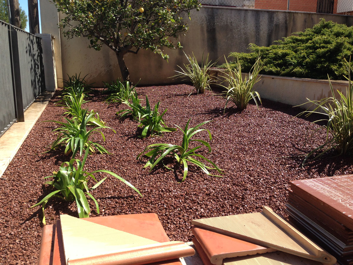 Restauració del jardí d’una casa unifamiliar amb gespa artificial. Plantació d’arbustos, formació de jardineres amb perfil corten i grava decorativa.