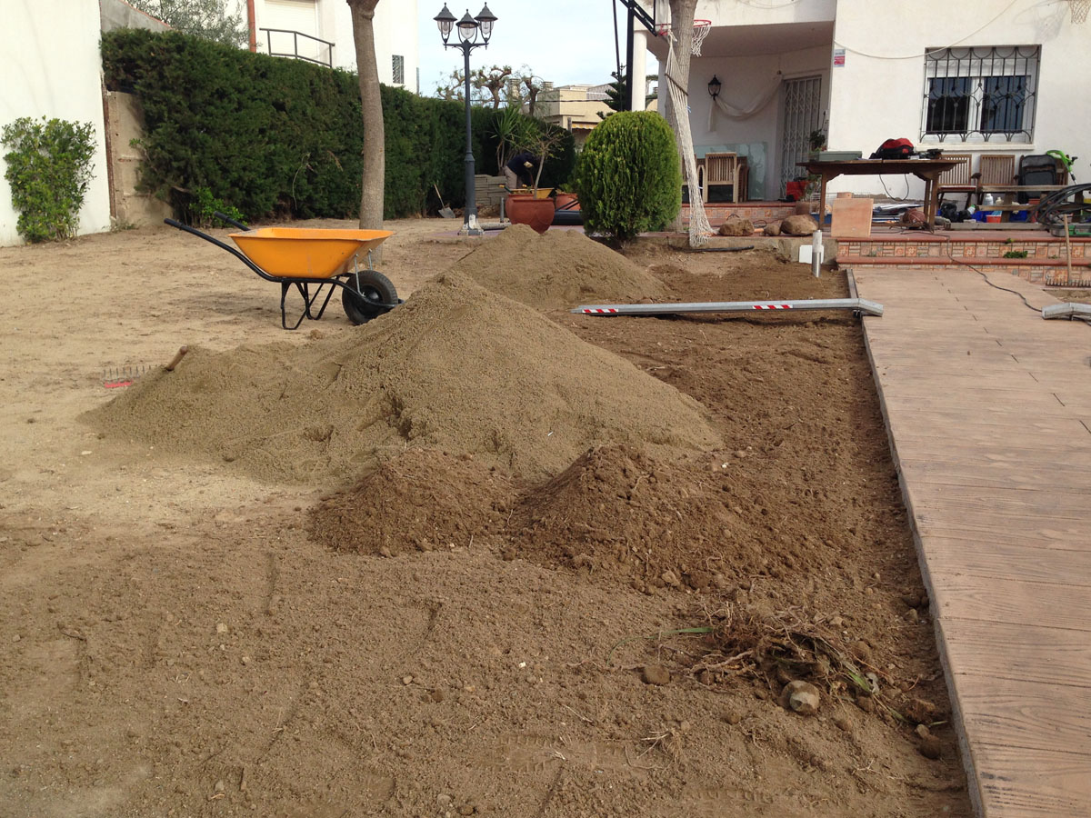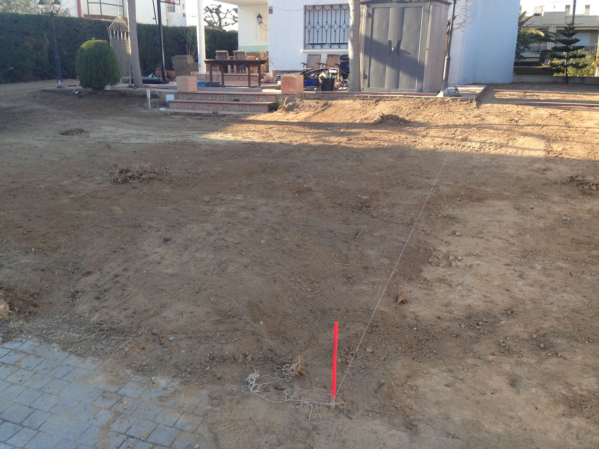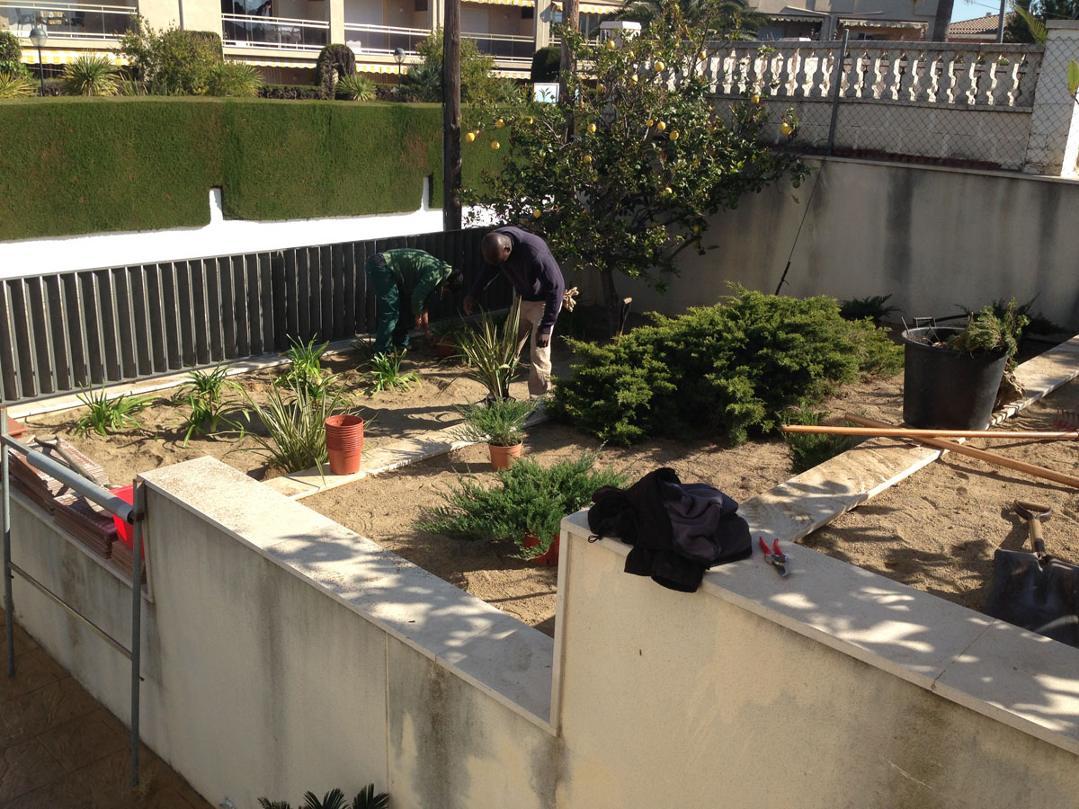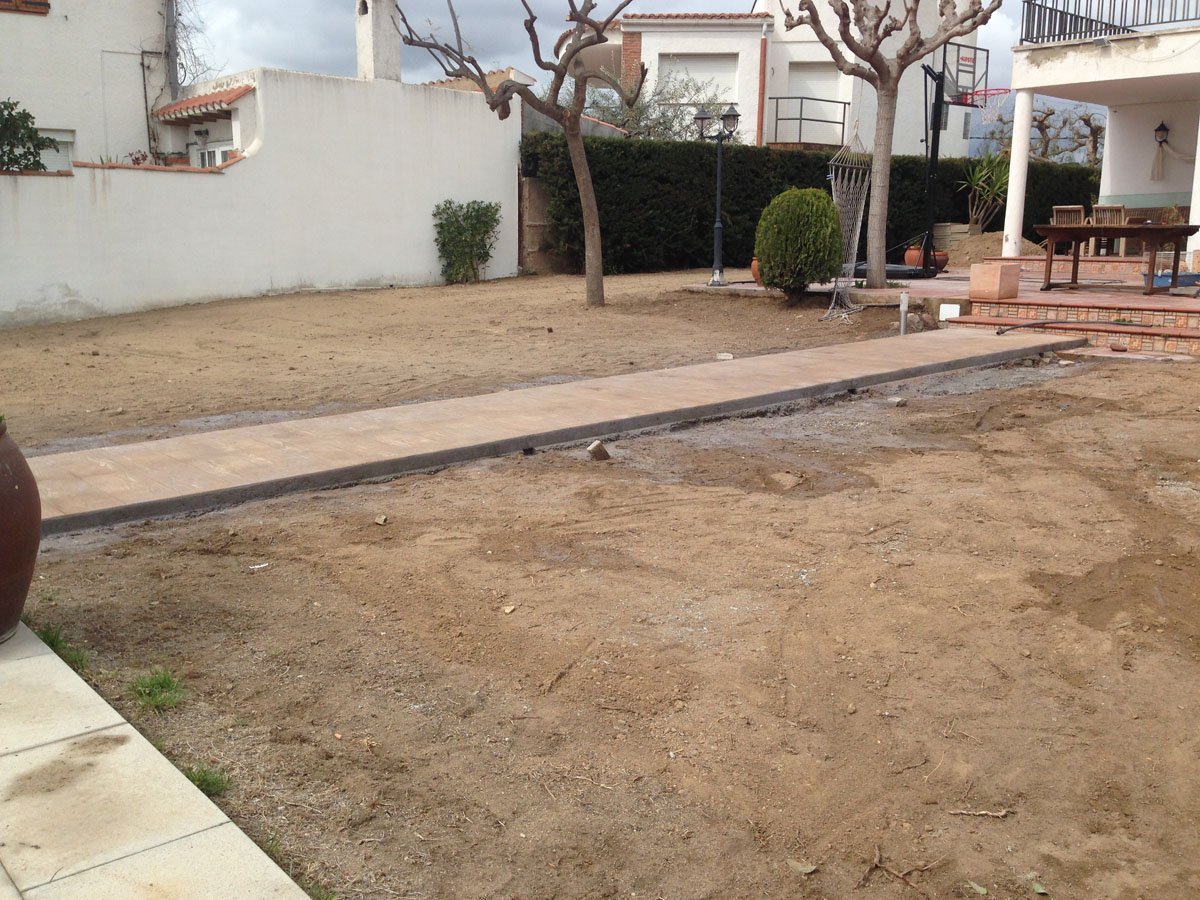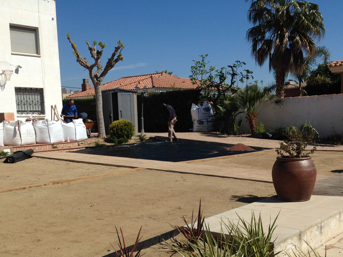 Restauració del jardí d’una casa unifamiliar amb gespa artificial. Plantació d’arbustos, formació de jardineres amb perfil corten i grava decorativa.