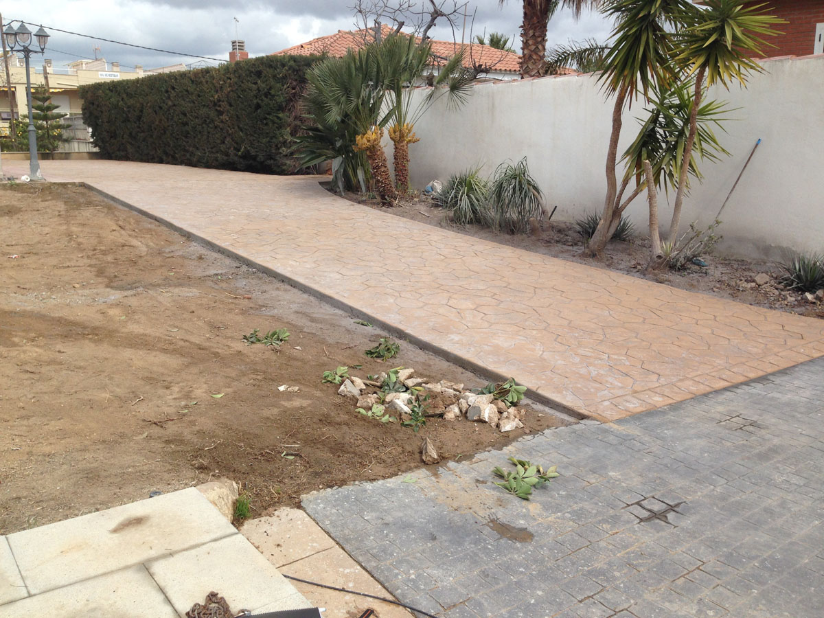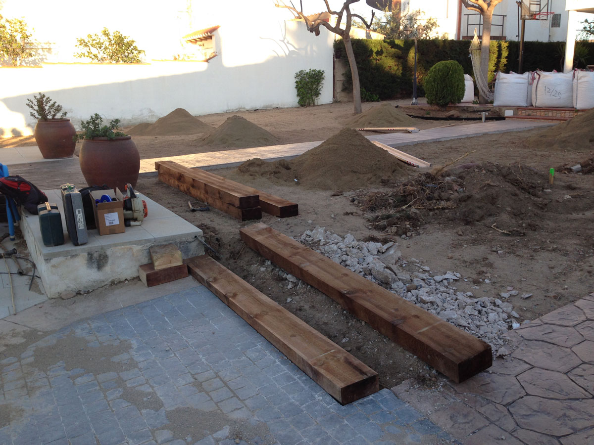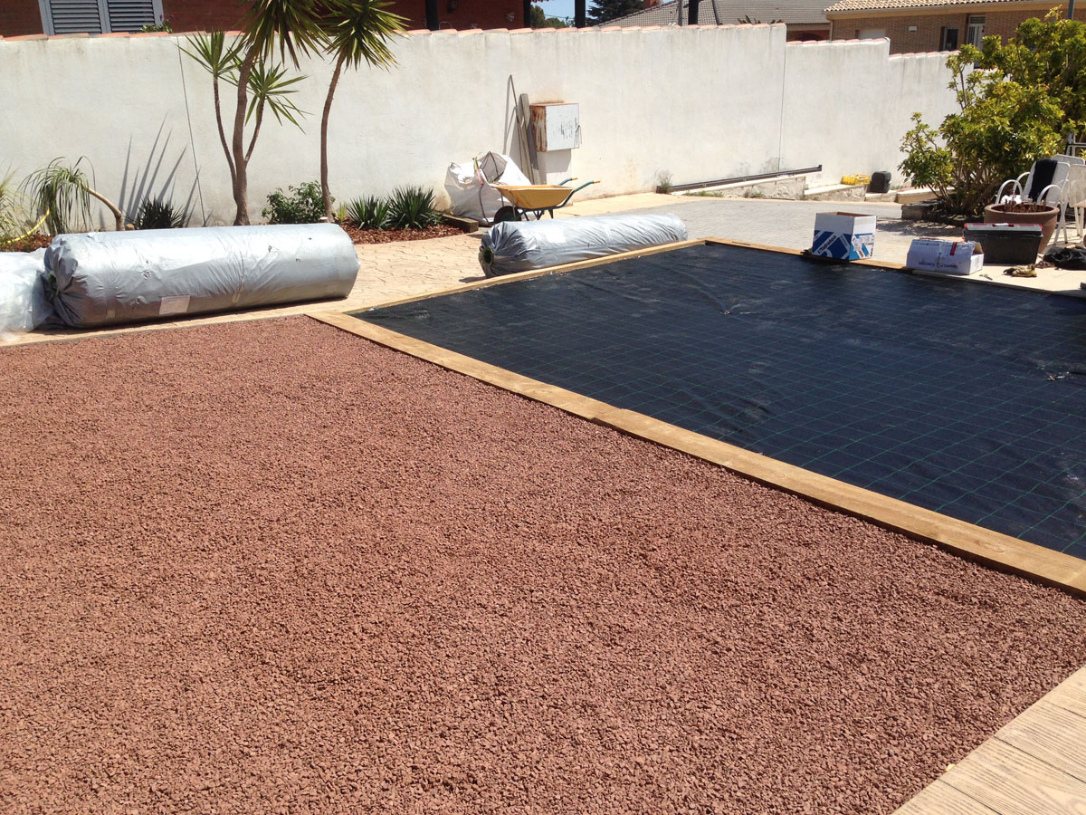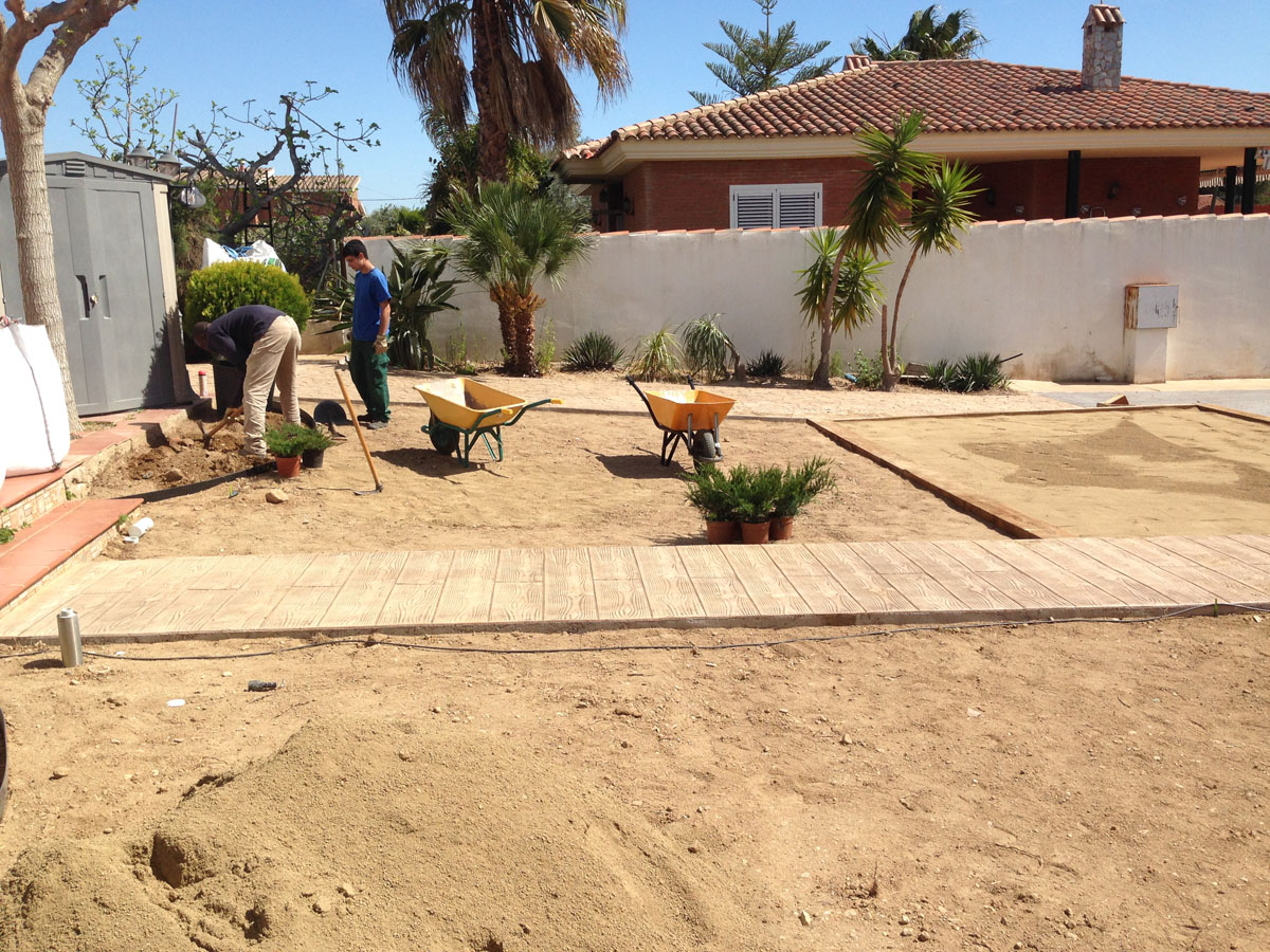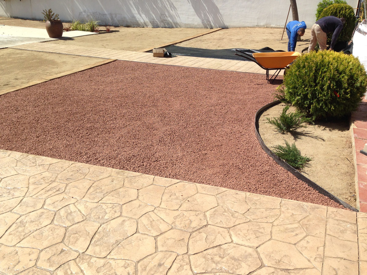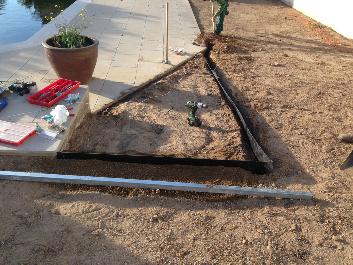 Restauració del jardí d’una casa unifamiliar amb gespa artificial. Plantació d’arbustos, formació de jardineres amb perfil corten i grava decorativa.